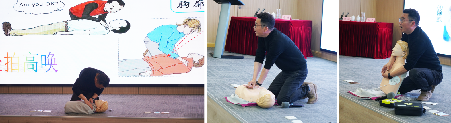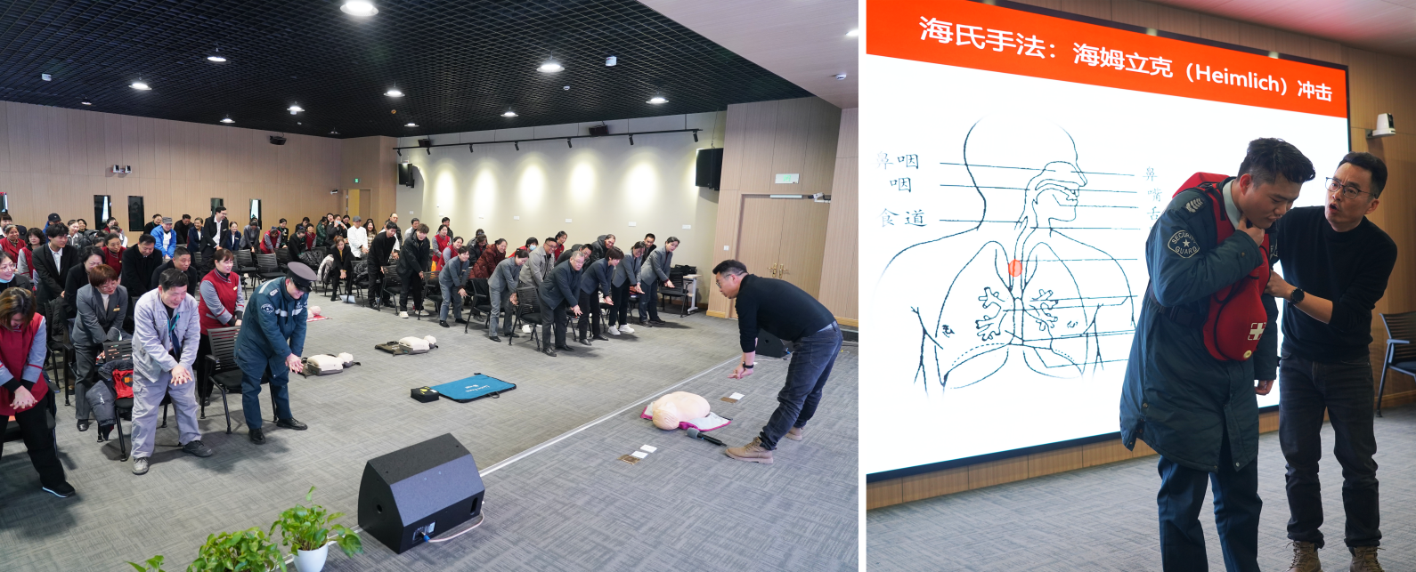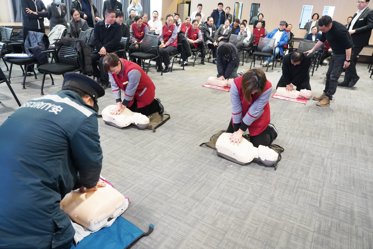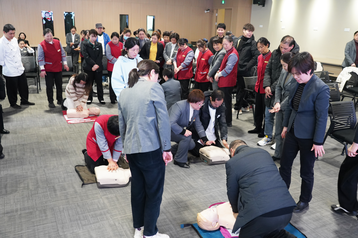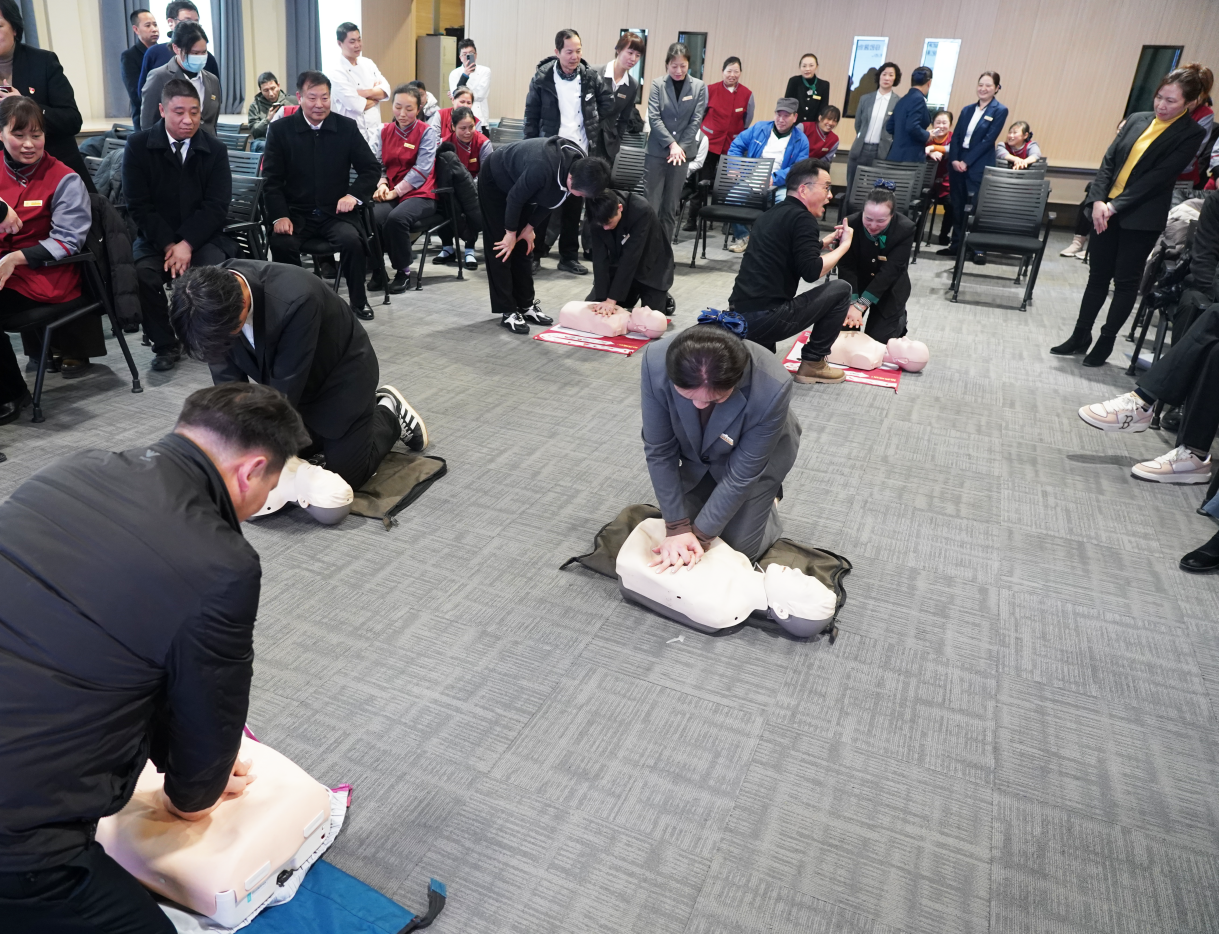 梁斌老师通过“示范-纠错-实操”三步教学法,指导员工利用人体模型进行胸外按压、人工呼吸及异物梗阻急救演练。